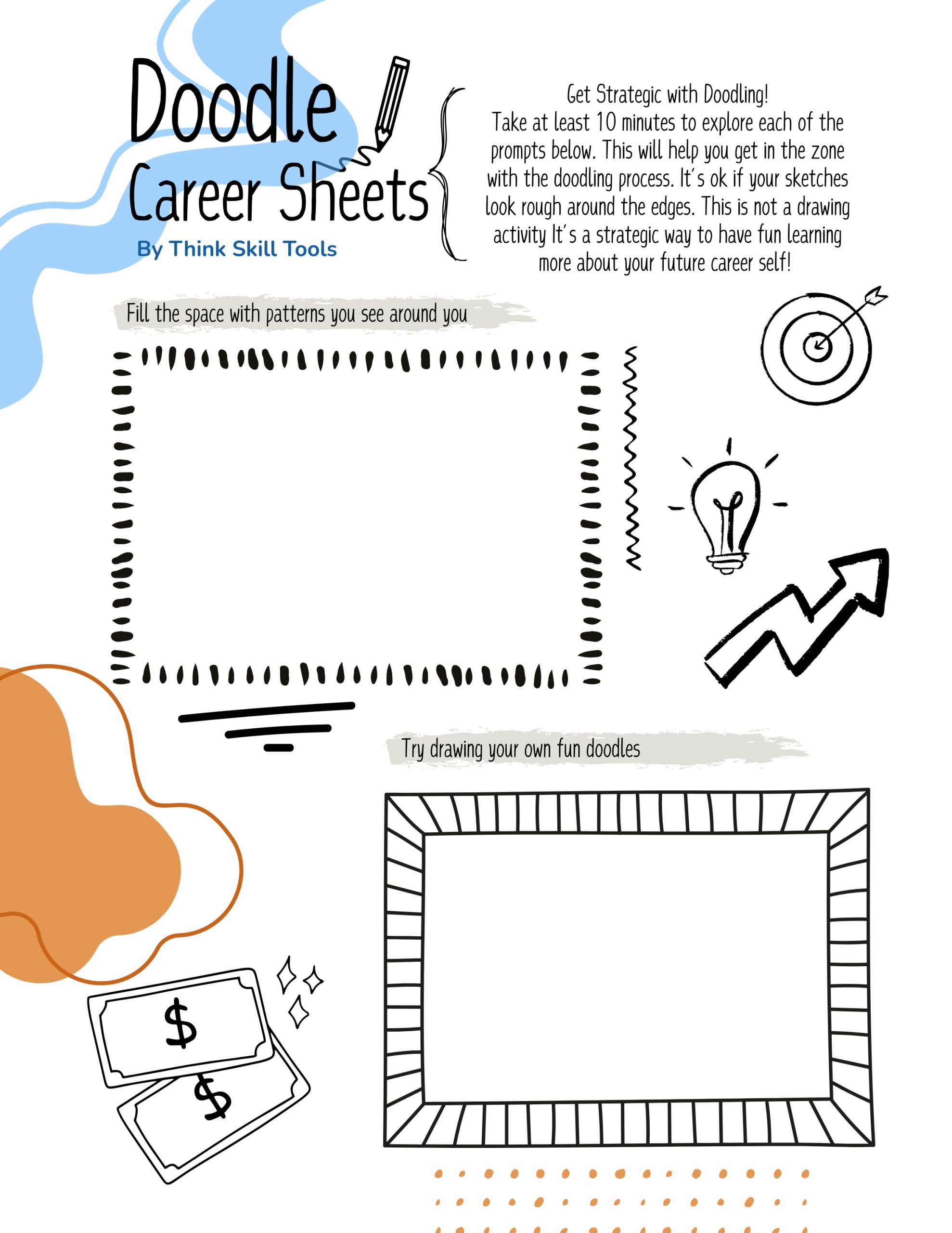 Dive into a world of creativity with our engaging doodle sheets, perfect for kids ages 8+. Younger-aged students would need someone to help read the instructions and explain what to do prior to doodling. These sheets make exploring career paths fun and interactive, sparking curiosity and excitement. That is what we are all about at Think Skill Tools!