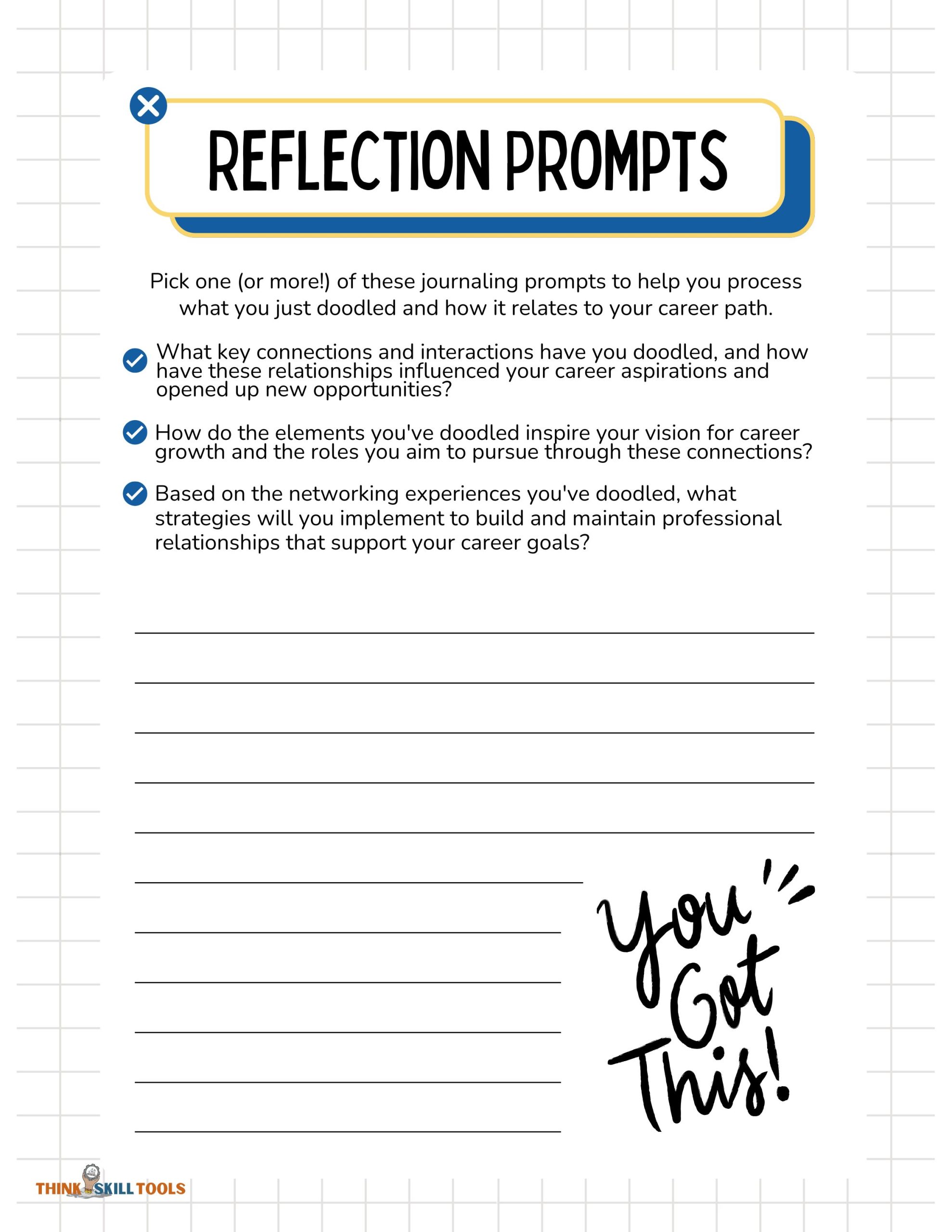 This doodle sheet contains a page that helps a student first practice the “art” of doodling. The goal of this activity is to boost confidence with a skill (yes, doodling is a skill for some people) and show students how this skill can be used as a powerful tool to explore key topics vital to their future career success. There are additional pages to doodle and a reflection prompt at the end to encourage journaling.