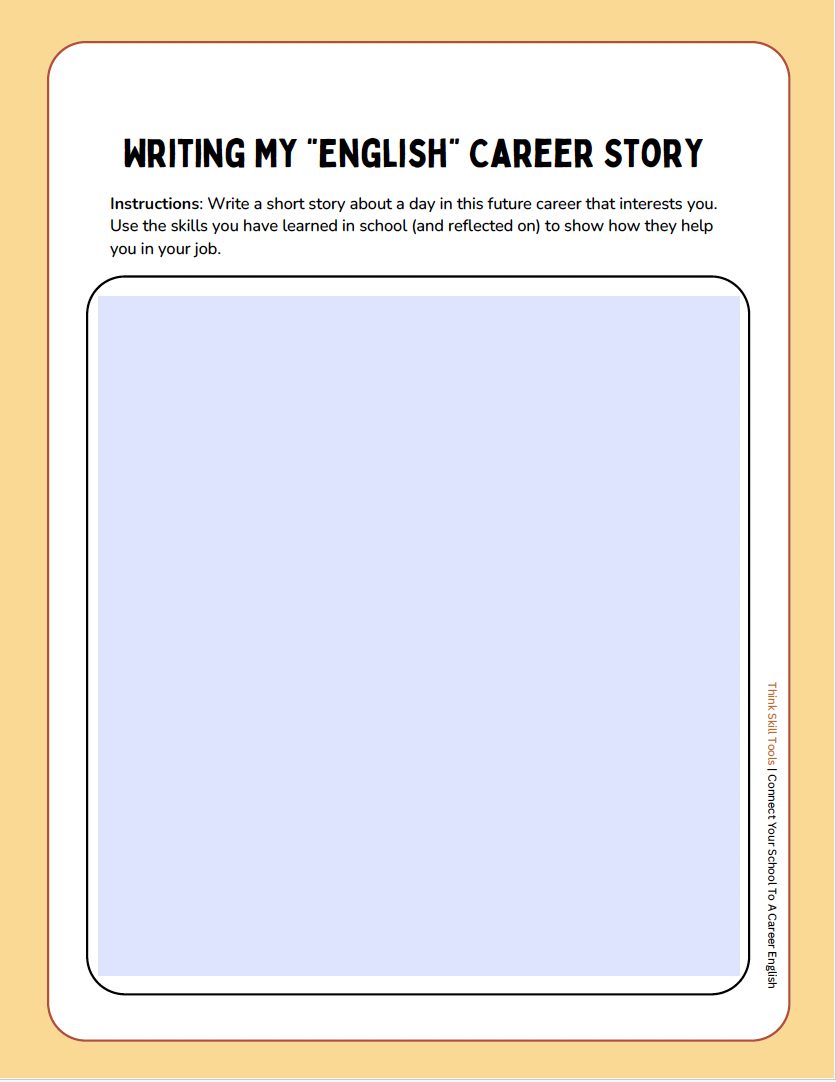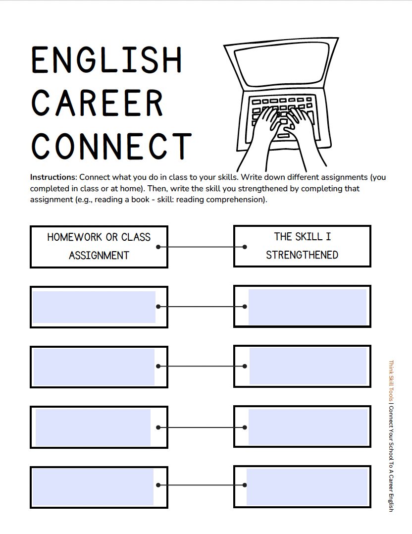 This seatwork activity shows students how the books they read in class, the writing assignment they complete, the essay they create absolutely connects to their future career self. Students will practice identifying skills strengthened when completing a homework and class assignment. They will use those identified skills to explore how they are related to their dream career.