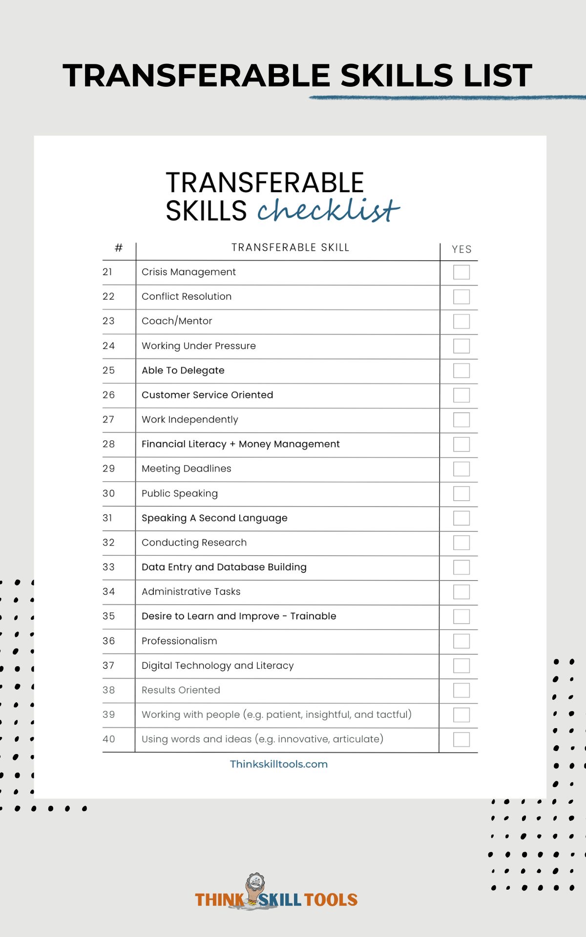 You have a ton of skills (soft and technical) that are waiting to be tapped into. The problem: you need to identify them! This review gives you a list of more than 30 transferable skills to reflect on and think about as you navigate your career change or pursue that dream career job.