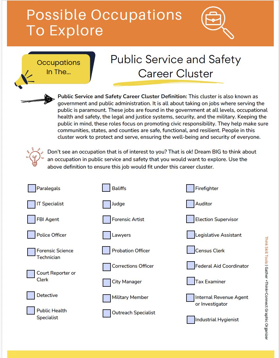 In this activity, students identify a job they would like to explore for the career cluster (Public Service and Safety). They conduct the research and use that research to make their own resume.