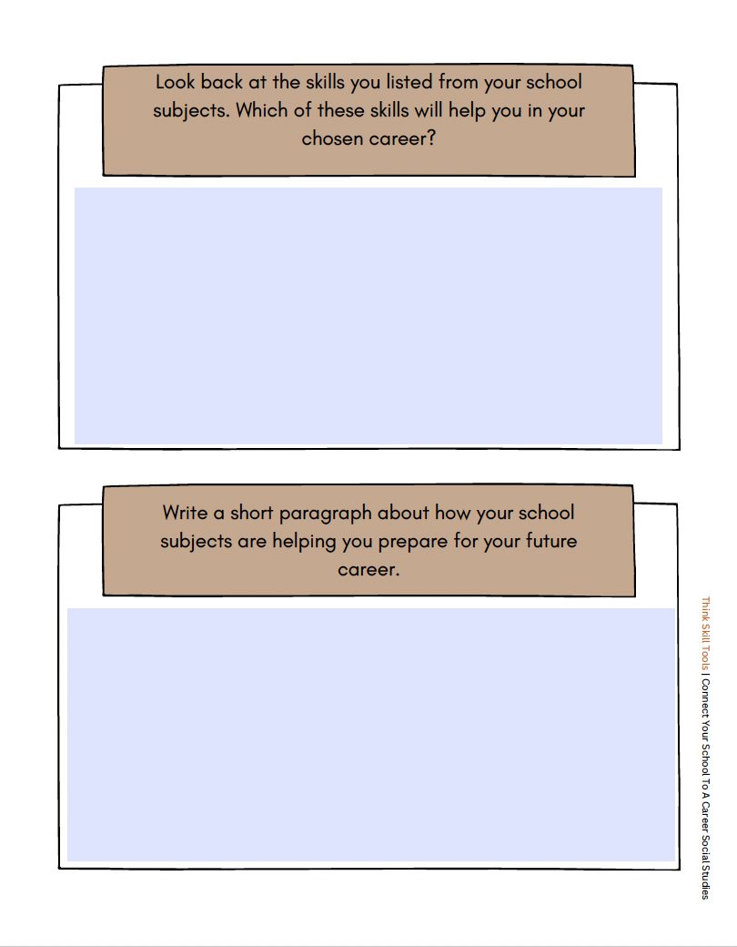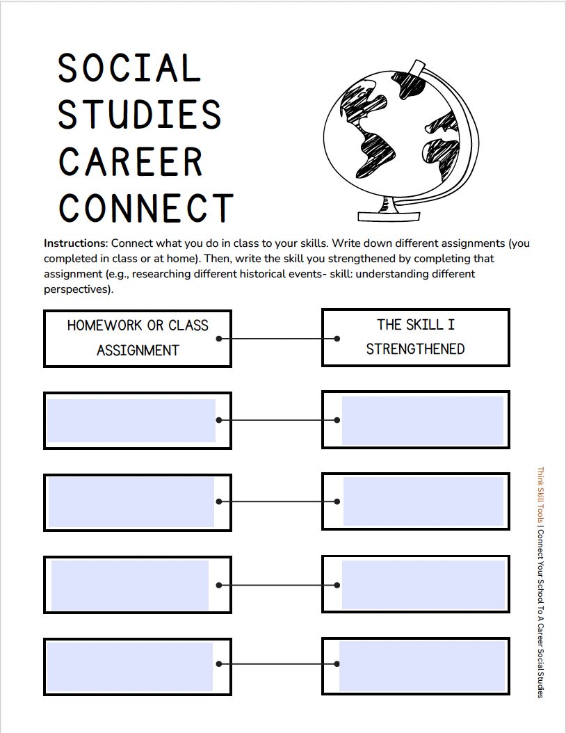This seatwork activity does just that. Students explore how their work in social studies related topics absolutely connects to their future career self. Students will practice identifying the skills strengthened when completing a homework and class assignment. They will use those identified skills to explore how they are related to their dream career.