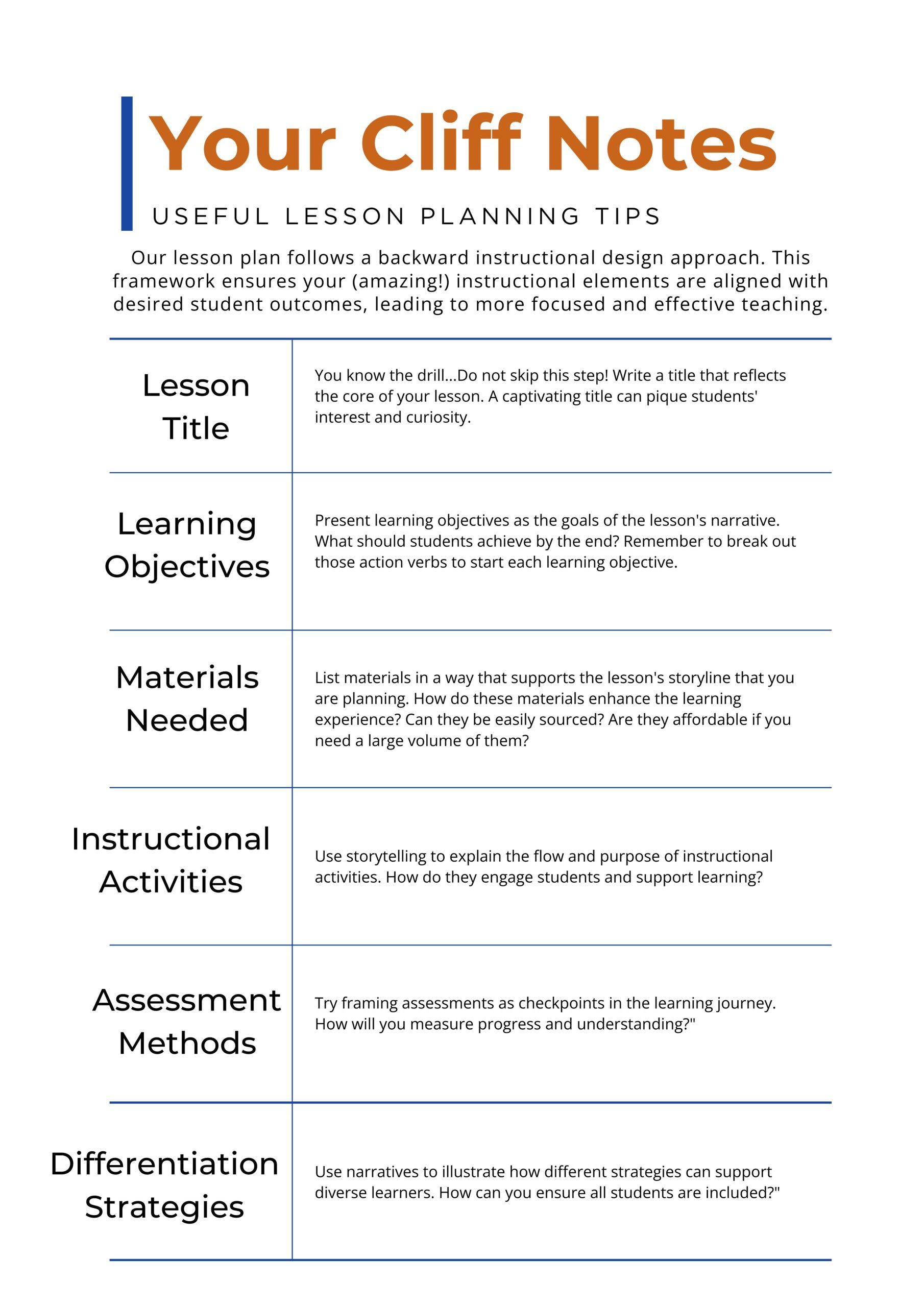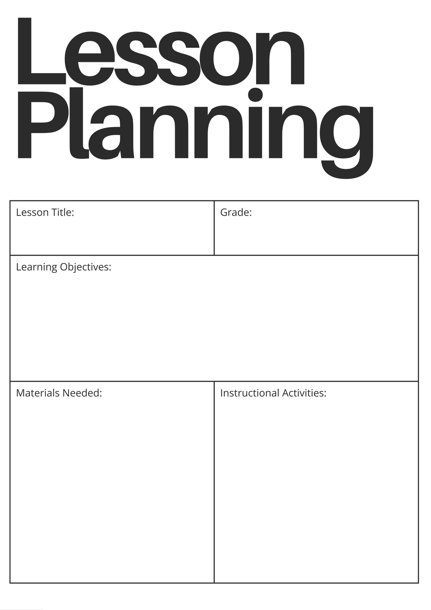 - Lesson Planning Worksheet: Design comprehensive lessons with defined learning objectives, instructional activities, and assessment methods.