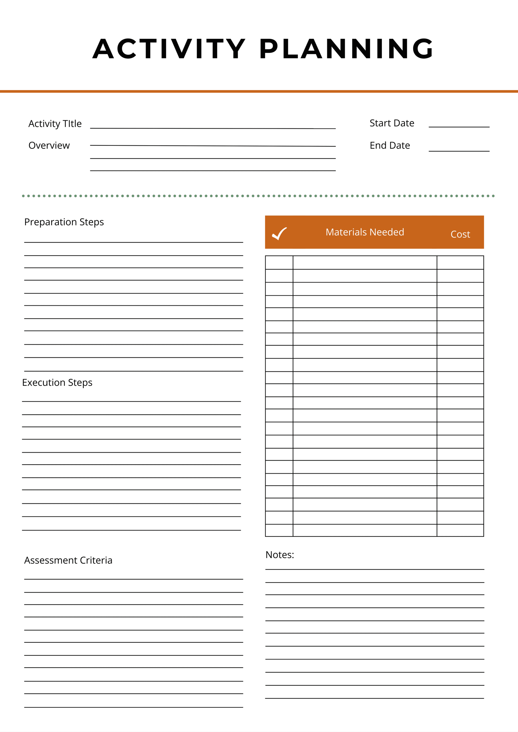 - Activity Planning Guide: Prepare and execute engaging activities with detailed steps and materials.