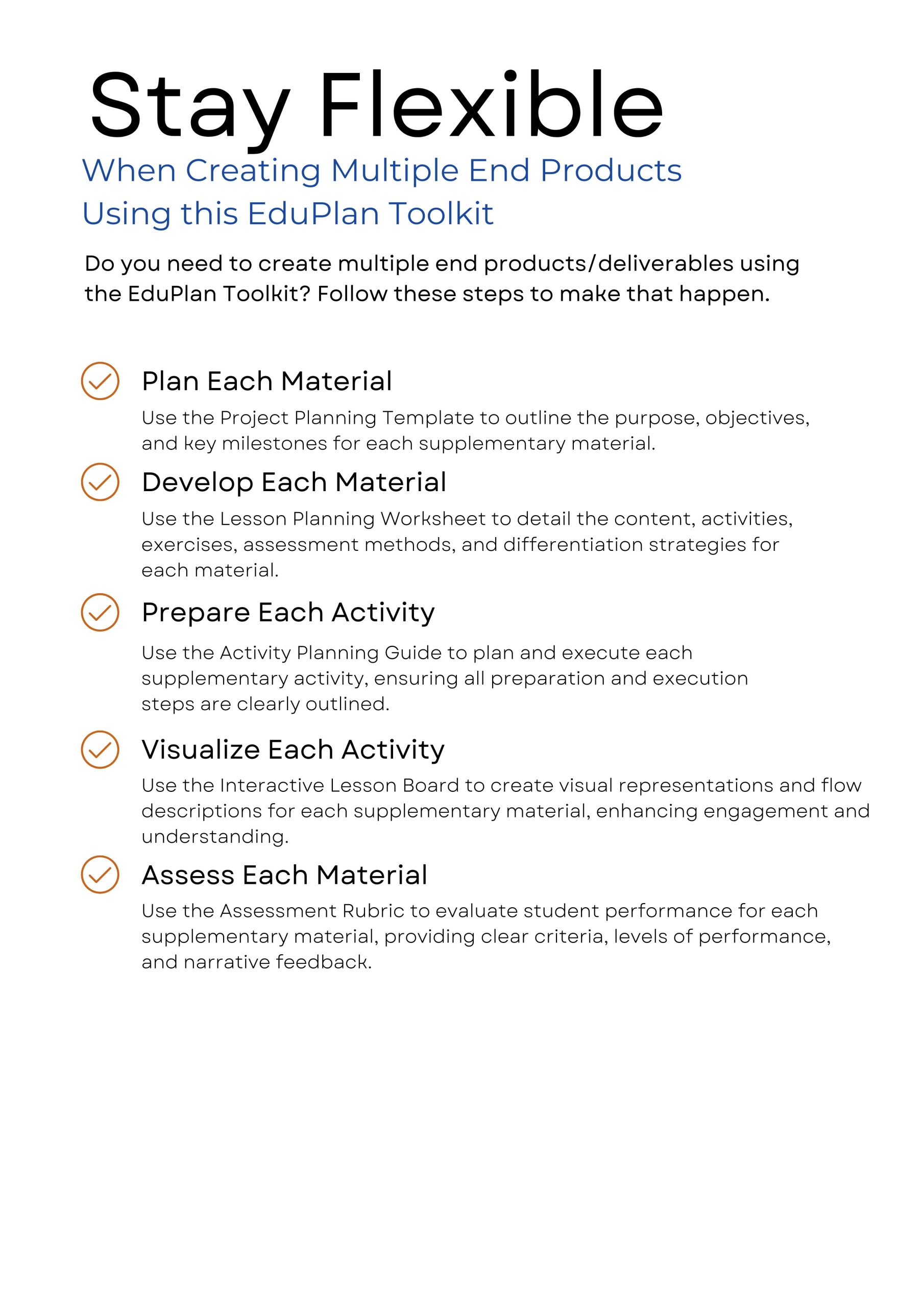 With the help of project management skills and the art of storytelling, create engaging and effective instructional materials for your students. The EduPlan toolkit helps educators plan and manage any project that involves creating instructional content for their students (e.g. think lesson plans, unit study builds, and more!) in a structured yet simplified and organized way.