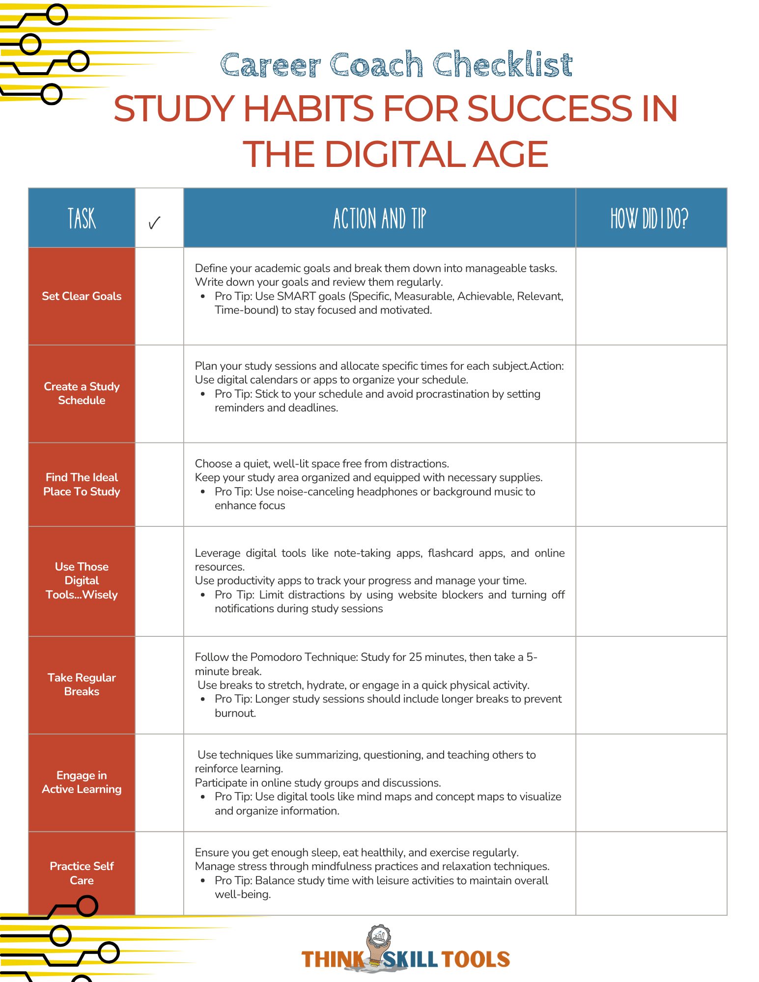 Checklist -Study Habits For Success In The Digital Age Note To Career Coaches: At Think Skill Tools we love a good freebie, which includes checklists like these. Developing effective study habits is essential for academic success, especially in the digital age. Use this checklist to enhance your study habits and make the most of digital […]